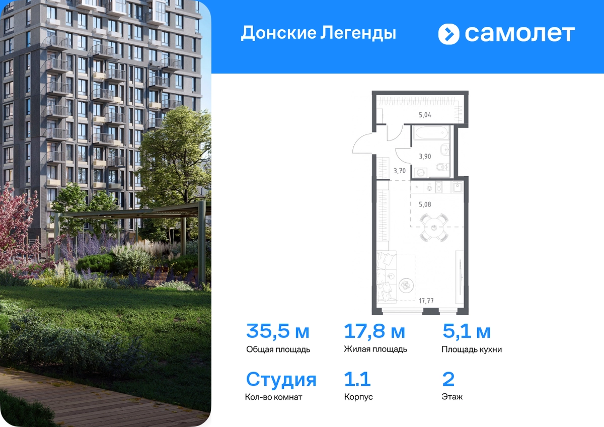 Строим кварталы для жизни с заботой о будущем. Предлагается квартира студия комфорт-класса 35,49 кв.м в корпусе 1.1 на 2 этаже, в ЖК «Донские Легенды» Квартира с предчистовой отделкой. Доступность дополнительных опций уточняйте у застройщика. Приобрести квартиру возможно по специальным акциям от застройщика, с текущими условиями акций можно ознакомиться в блоке «Акций». Цена динамическая и может отличаться, уточняйте актуальность у застройщика. Чувствовать гордость, когда любимая команда забивает гол, и с удовольствием спешить на тренировку по мини-футболу или теннису — так выглядит атмосфера в «Квартале Чехова» в Ленинском районе. Здесь каждый день станет ценным экспонатом в вашей коллекции впечатлений. Проект расположен рядом с Восточным шоссе и улицей Пойменной, всего в 10 минутах на машине от центра города. За 3 минуты вы доберетесь до Ворошиловского моста, а за 4 — до Темерницкого. Если не хотите ехать на машине, рядом остановки автобусов. Поблизости находится спортивный комплекс «Гребной канал Дон», а стадион «Ростов Арена» ждет любителей футбола. Прогуляться по благоустроенной набережной, повеселиться в аквапарке и подкрепиться мороженым можно в Левобережном парке — до него 5 минут на такси. Утро начнется с прогулки с малышом до одного из 3 детских садов. Рядом есть школа для ребят постарше, детская школа искусств, центр культурного развития и ФОК. В квартале откроются поликлиника со станцией скорой помощи и 2 торговых центра. Архитектура квартала сочетает современность и изящество. Элегантные французские балконы и панорамные окна позволят наслаждаться великолепными пейзажами. Во дворе дети играют на площадках, а взрослые занимаются спортом. У жителей будет собственный ипподром для соревнований по конкуру. А еще подземный и многоуровневые паркинги на 7,5 тысячи машино-мест. Входы в подъезды расположены на уровне земли, что удобно для родителей с колясками и путешественников. Для будущих жителей — квартиры без отделки. Можно реализовать любые дизайнерские идеи в своем новом доме.#yan19-2r1777120#О застройщике