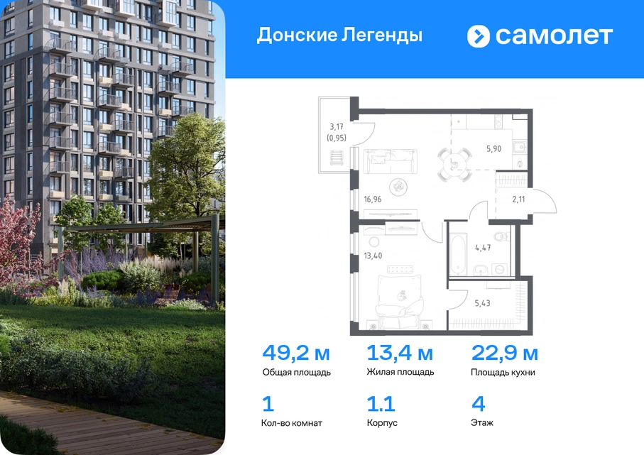 Строим кварталы для жизни с заботой о будущем. Предлагается 1-комнатная квартира комфорт-класса 49,22 кв.м в корпусе 1.1 на 4 этаже, в ЖК «Донские Легенды» Квартира с предчистовой отделкой. Доступность дополнительных опций уточняйте у застройщика. Приобрести квартиру возможно по специальным акциям от застройщика, с текущими условиями акций можно ознакомиться в блоке «Акций». Цена динамическая и может отличаться, уточняйте актуальность у застройщика. Чувствовать гордость, когда любимая команда забивает гол, и с удовольствием спешить на тренировку по мини-футболу или теннису — так выглядит атмосфера в «Квартале Чехова» в Ленинском районе. Здесь каждый день станет ценным экспонатом в вашей коллекции впечатлений. Проект расположен рядом с Восточным шоссе и улицей Пойменной, всего в 10 минутах на машине от центра города. За 3 минуты вы доберетесь до Ворошиловского моста, а за 4 — до Темерницкого. Если не хотите ехать на машине, рядом остановки автобусов. Поблизости находится спортивный комплекс «Гребной канал Дон», а стадион «Ростов Арена» ждет любителей футбола. Прогуляться по благоустроенной набережной, повеселиться в аквапарке и подкрепиться мороженым можно в Левобережном парке — до него 5 минут на такси. Утро начнется с прогулки с малышом до одного из 3 детских садов. Рядом есть школа для ребят постарше, детская школа искусств, центр культурного развития и ФОК. В квартале откроются поликлиника со станцией скорой помощи и 2 торговых центра. Архитектура квартала сочетает современность и изящество. Элегантные французские балконы и панорамные окна позволят наслаждаться великолепными пейзажами. Во дворе дети играют на площадках, а взрослые занимаются спортом. У жителей будет собственный ипподром для соревнований по конкуру. А еще подземный и многоуровневые паркинги на 7,5 тысячи машино-мест. Входы в подъезды расположены на уровне земли, что удобно для родителей с колясками и путешественников. Для будущих жителей — квартиры без отделки. Можно реализовать любые дизайнерские идеи в своем новом доме.#yan19-2r1777214#О застройщике
