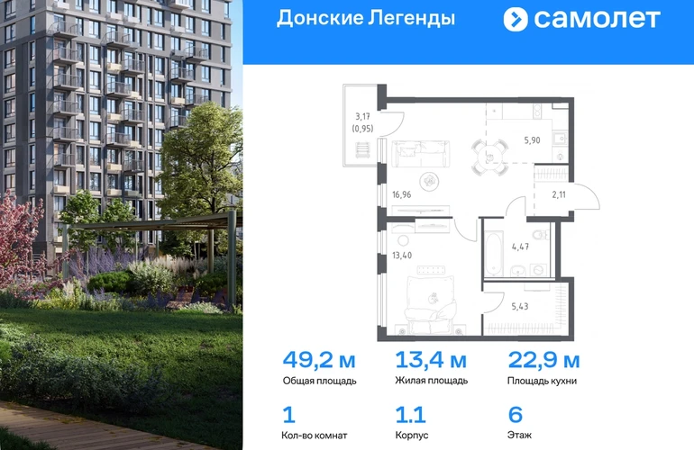 Строим кварталы для жизни с заботой о будущем. Предлагается 1-комнатная квартира комфорт-класса 49,22 кв.м в корпусе 1.1 на 6 этаже, в ЖК «Донские Легенды» Квартира с предчистовой отделкой. Доступность дополнительных опций уточняйте у застройщика. Приобрести квартиру возможно по специальным акциям от застройщика, с текущими условиями акций можно ознакомиться в блоке «Акций». Цена динамическая и может отличаться, уточняйте актуальность у застройщика. Чувствовать гордость, когда любимая команда забивает гол, и с удовольствием спешить на тренировку по мини-футболу или теннису — так выглядит атмосфера в «Квартале Чехова» в Ленинском районе. Здесь каждый день станет ценным экспонатом в вашей коллекции впечатлений. Проект расположен рядом с Восточным шоссе и улицей Пойменной, всего в 10 минутах на машине от центра города. За 3 минуты вы доберетесь до Ворошиловского моста, а за 4 — до Темерницкого. Если не хотите ехать на машине, рядом остановки автобусов. Поблизости находится спортивный комплекс «Гребной канал Дон», а стадион «Ростов Арена» ждет любителей футбола. Прогуляться по благоустроенной набережной, повеселиться в аквапарке и подкрепиться мороженым можно в Левобережном парке — до него 5 минут на такси. Утро начнется с прогулки с малышом до одного из 3 детских садов. Рядом есть школа для ребят постарше, детская школа искусств, центр культурного развития и ФОК. В квартале откроются поликлиника со станцией скорой помощи и 2 торговых центра. Архитектура квартала сочетает современность и изящество. Элегантные французские балконы и панорамные окна позволят наслаждаться великолепными пейзажами. Во дворе дети играют на площадках, а взрослые занимаются спортом. У жителей будет собственный ипподром для соревнований по конкуру. А еще подземный и многоуровневые паркинги на 7,5 тысячи машино-мест. Входы в подъезды расположены на уровне земли, что удобно для родителей с колясками и путешественников. Для будущих жителей — квартиры без отделки. Можно реализовать любые дизайнерские идеи в своем новом доме.#yan19-2r1777217#О застройщике
