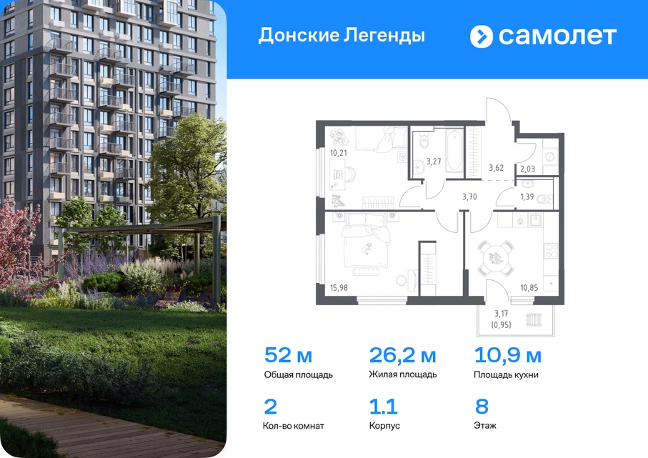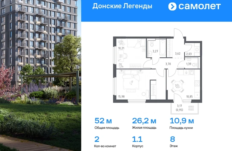 Строим кварталы для жизни с заботой о будущем. Предлагается 2-комнатная квартира комфорт-класса 52 кв.м в корпусе 1.1 на 8 этаже, в ЖК «Донские Легенды» Квартира без отделки. Доступность опции «отделка» и возможность комплектации мебелью и декором уточняйте у застройщика. Приобрести квартиру возможно по специальным акциям от застройщика, с текущими условиями акций можно ознакомиться в блоке «Акций». Цена динамическая и может отличаться, уточняйте актуальность у застройщика. Чувствовать гордость, когда любимая команда забивает гол, и с удовольствием спешить на тренировку по мини-футболу или теннису — так выглядит атмосфера в «Квартале Чехова» в Ленинском районе. Здесь каждый день станет ценным экспонатом в вашей коллекции впечатлений. Проект расположен рядом с Восточным шоссе и улицей Пойменной, всего в 10 минутах на машине от центра города. За 3 минуты вы доберетесь до Ворошиловского моста, а за 4 — до Темерницкого. Если не хотите ехать на машине, рядом остановки автобусов. Поблизости находится спортивный комплекс «Гребной канал Дон», а стадион «Ростов Арена» ждет любителей футбола. Прогуляться по благоустроенной набережной, повеселиться в аквапарке и подкрепиться мороженым можно в Левобережном парке — до него 5 минут на такси. Утро начнется с прогулки с малышом до одного из 3 детских садов. Рядом есть школа для ребят постарше, детская школа искусств, центр культурного развития и ФОК. В квартале откроются поликлиника со станцией скорой помощи и 2 торговых центра. Архитектура квартала сочетает современность и изящество. Элегантные французские балконы и панорамные окна позволят наслаждаться великолепными пейзажами. Во дворе дети играют на площадках, а взрослые занимаются спортом. У жителей будет собственный ипподром для соревнований по конкуру. А еще подземный и многоуровневые паркинги на 7,5 тысячи машино-мест. Входы в подъезды расположены на уровне земли, что удобно для родителей с колясками и путешественников. Для будущих жителей — квартиры без отделки. Можно реализовать любые дизайнерские идеи в своем новом доме.#yan19-2r1777242#О застройщике