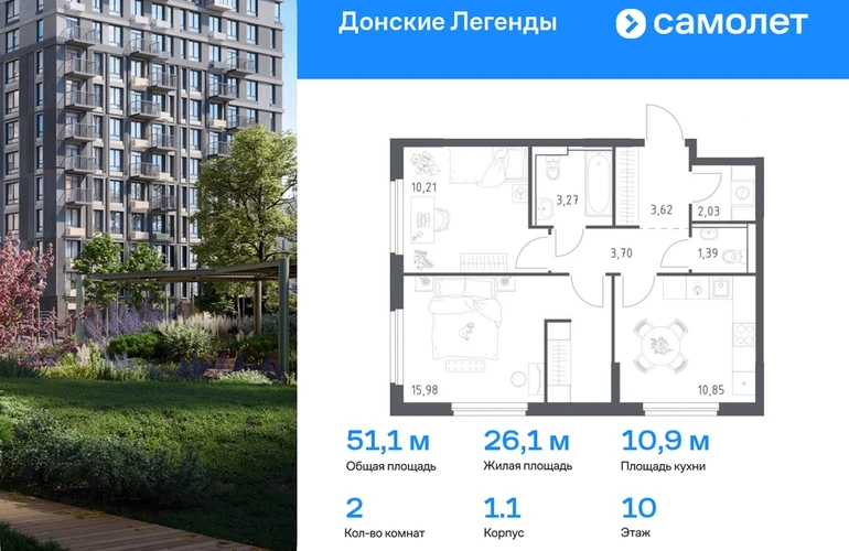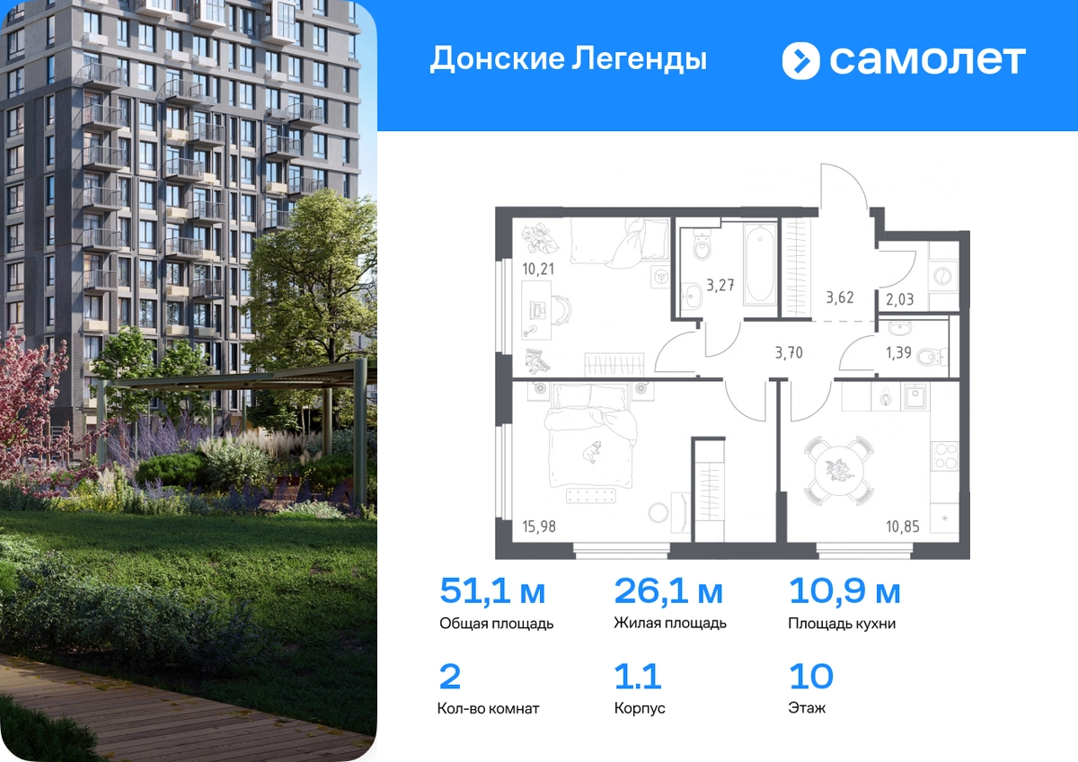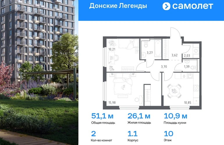 Строим кварталы для жизни с заботой о будущем. Предлагается 2-комнатная квартира комфорт-класса 51,05 кв.м в корпусе 1.1 на 10 этаже, в ЖК «Донские Легенды» Квартира без отделки. Доступность опции «отделка» и возможность комплектации мебелью и декором уточняйте у застройщика. Приобрести квартиру возможно по специальным акциям от застройщика, с текущими условиями акций можно ознакомиться в блоке «Акций». Цена динамическая и может отличаться, уточняйте актуальность у застройщика. Чувствовать гордость, когда любимая команда забивает гол, и с удовольствием спешить на тренировку по мини-футболу или теннису — так выглядит атмосфера в «Квартале Чехова» в Ленинском районе. Здесь каждый день станет ценным экспонатом в вашей коллекции впечатлений. Проект расположен рядом с Восточным шоссе и улицей Пойменной, всего в 10 минутах на машине от центра города. За 3 минуты вы доберетесь до Ворошиловского моста, а за 4 — до Темерницкого. Если не хотите ехать на машине, рядом остановки автобусов. Поблизости находится спортивный комплекс «Гребной канал Дон», а стадион «Ростов Арена» ждет любителей футбола. Прогуляться по благоустроенной набережной, повеселиться в аквапарке и подкрепиться мороженым можно в Левобережном парке — до него 5 минут на такси. Утро начнется с прогулки с малышом до одного из 3 детских садов. Рядом есть школа для ребят постарше, детская школа искусств, центр культурного развития и ФОК. В квартале откроются поликлиника со станцией скорой помощи и 2 торговых центра. Архитектура квартала сочетает современность и изящество. Элегантные французские балконы и панорамные окна позволят наслаждаться великолепными пейзажами. Во дворе дети играют на площадках, а взрослые занимаются спортом. У жителей будет собственный ипподром для соревнований по конкуру. А еще подземный и многоуровневые паркинги на 7,5 тысячи машино-мест. Входы в подъезды расположены на уровне земли, что удобно для родителей с колясками и путешественников. Для будущих жителей — квартиры без отделки. Можно реализовать любые дизайнерские идеи в своем новом доме.#yan19-2r1777252#О застройщике