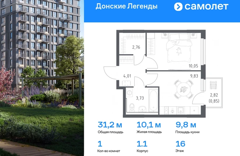 Предлагается 1-комнатная квартира комфорт-класса 31,23 кв.м в корпусе 1.1 на 16 этаже, в ЖК «Донские Легенды» Квартира с предчистовой отделкой. Доступность дополнительных опций уточняйте у застройщика. Приобрести квартиру возможно по специальным акциям от застройщика, с текущими условиями акций можно ознакомиться в блоке «Акций». Цена динамическая и может отличаться, уточняйте актуальность у застройщика. Чувствовать гордость, когда любимая команда забивает гол, и с удовольствием спешить на тренировку по мини-футболу или теннису — так выглядит атмосфера в «Квартале Чехова» в Ленинском районе. Здесь каждый день станет ценным экспонатом в вашей коллекции впечатлений. Проект расположен рядом с Восточным шоссе и улицей Пойменной, всего в 10 минутах на машине от центра города. За 3 минуты вы доберетесь до Ворошиловского моста, а за 4 — до Темерницкого. Если не хотите ехать на машине, рядом остановки автобусов. Поблизости находится спортивный комплекс «Гребной канал Дон», а стадион «Ростов Арена» ждет любителей футбола. Прогуляться по благоустроенной набережной, повеселиться в аквапарке и подкрепиться мороженым можно в Левобережном парке — до него 5 минут на такси. Утро начнется с прогулки с малышом до одного из 3 детских садов. Рядом есть школа для ребят постарше, детская школа искусств, центр культурного развития и ФОК. В квартале откроются поликлиника со станцией скорой помощи и 2 торговых центра. Архитектура квартала сочетает современность и изящество. Элегантные французские балконы и панорамные окна позволят наслаждаться великолепными пейзажами. Во дворе дети играют на площадках, а взрослые занимаются спортом. У жителей будет собственный ипподром для соревнований по конкуру. А еще подземный и многоуровневые паркинги на 7,5 тысячи машино-мест. Входы в подъезды расположены на уровне земли, что удобно для родителей с колясками и путешественников. Для будущих жителей — квартиры без отделки. Можно реализовать любые дизайнерские идеи в своем новом доме.#yan19-2r1787317#О застройщике