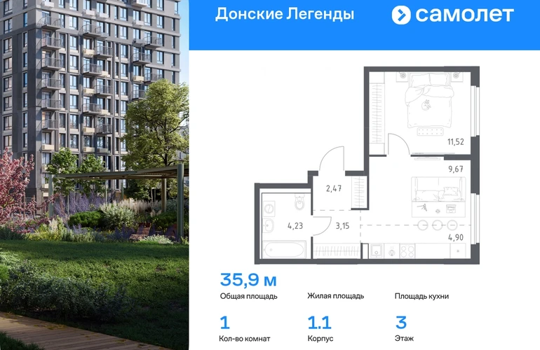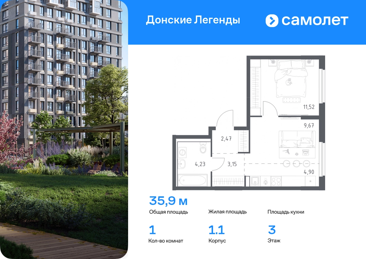 Строим кварталы для жизни с заботой о будущем. Предлагается 1-комнатная квартира комфорт-класса 35,94 кв.м в корпусе 1.1 на 3 этаже, в ЖК «Донские Легенды» Квартира без отделки. Доступность опции «отделка» и возможность комплектации мебелью и декором уточняйте у застройщика. Приобрести квартиру возможно по специальным акциям от застройщика, с текущими условиями акций можно ознакомиться в блоке «Акций». Цена динамическая и может отличаться, уточняйте актуальность у застройщика. Чувствовать гордость, когда любимая команда забивает гол, и с удовольствием спешить на тренировку по мини-футболу или теннису — так выглядит атмосфера в «Квартале Чехова» в Ленинском районе. Здесь каждый день станет ценным экспонатом в вашей коллекции впечатлений. Проект расположен рядом с Восточным шоссе и улицей Пойменной, всего в 10 минутах на машине от центра города. За 3 минуты вы доберетесь до Ворошиловского моста, а за 4 — до Темерницкого. Если не хотите ехать на машине, рядом остановки автобусов. Поблизости находится спортивный комплекс «Гребной канал Дон», а стадион «Ростов Арена» ждет любителей футбола. Прогуляться по благоустроенной набережной, повеселиться в аквапарке и подкрепиться мороженым можно в Левобережном парке — до него 5 минут на такси. Утро начнется с прогулки с малышом до одного из 3 детских садов. Рядом есть школа для ребят постарше, детская школа искусств, центр культурного развития и ФОК. В квартале откроются поликлиника со станцией скорой помощи и 2 торговых центра. Архитектура квартала сочетает современность и изящество. Элегантные французские балконы и панорамные окна позволят наслаждаться великолепными пейзажами. Во дворе дети играют на площадках, а взрослые занимаются спортом. У жителей будет собственный ипподром для соревнований по конкуру. А еще подземный и многоуровневые паркинги на 7,5 тысячи машино-мест. Входы в подъезды расположены на уровне земли, что удобно для родителей с колясками и путешественников. Для будущих жителей — квартиры без отделки. Можно реализовать любые дизайнерские идеи в своем новом доме.#yan19-2r1787321#О застройщике