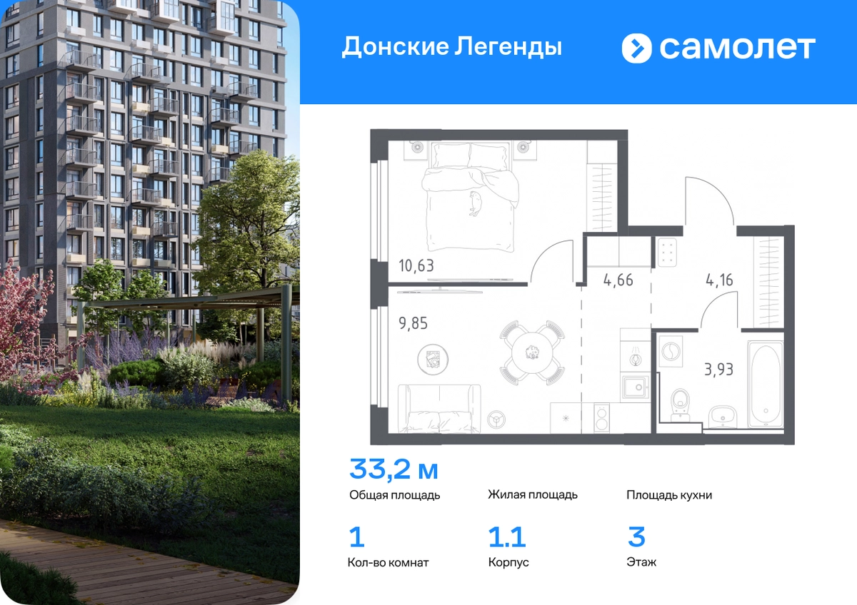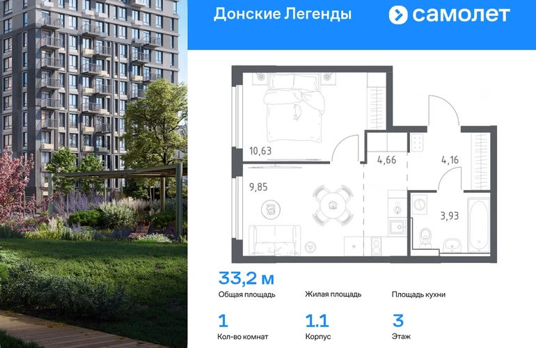 Строим кварталы для жизни с заботой о будущем. Предлагается 1-комнатная квартира комфорт-класса 33,23 кв.м в корпусе 1.1 на 3 этаже, в ЖК «Донские Легенды» Квартира с предчистовой отделкой. Доступность дополнительных опций уточняйте у застройщика. Приобрести квартиру возможно по специальным акциям от застройщика, с текущими условиями акций можно ознакомиться в блоке «Акций». Цена динамическая и может отличаться, уточняйте актуальность у застройщика. Чувствовать гордость, когда любимая команда забивает гол, и с удовольствием спешить на тренировку по мини-футболу или теннису — так выглядит атмосфера в «Квартале Чехова» в Ленинском районе. Здесь каждый день станет ценным экспонатом в вашей коллекции впечатлений. Проект расположен рядом с Восточным шоссе и улицей Пойменной, всего в 10 минутах на машине от центра города. За 3 минуты вы доберетесь до Ворошиловского моста, а за 4 — до Темерницкого. Если не хотите ехать на машине, рядом остановки автобусов. Поблизости находится спортивный комплекс «Гребной канал Дон», а стадион «Ростов Арена» ждет любителей футбола. Прогуляться по благоустроенной набережной, повеселиться в аквапарке и подкрепиться мороженым можно в Левобережном парке — до него 5 минут на такси. Утро начнется с прогулки с малышом до одного из 3 детских садов. Рядом есть школа для ребят постарше, детская школа искусств, центр культурного развития и ФОК. В квартале откроются поликлиника со станцией скорой помощи и 2 торговых центра. Архитектура квартала сочетает современность и изящество. Элегантные французские балконы и панорамные окна позволят наслаждаться великолепными пейзажами. Во дворе дети играют на площадках, а взрослые занимаются спортом. У жителей будет собственный ипподром для соревнований по конкуру. А еще подземный и многоуровневые паркинги на 7,5 тысячи машино-мест. Входы в подъезды расположены на уровне земли, что удобно для родителей с колясками и путешественников. Для будущих жителей — квартиры без отделки. Можно реализовать любые дизайнерские идеи в своем новом доме.#yan19-2r1788805#О застройщике