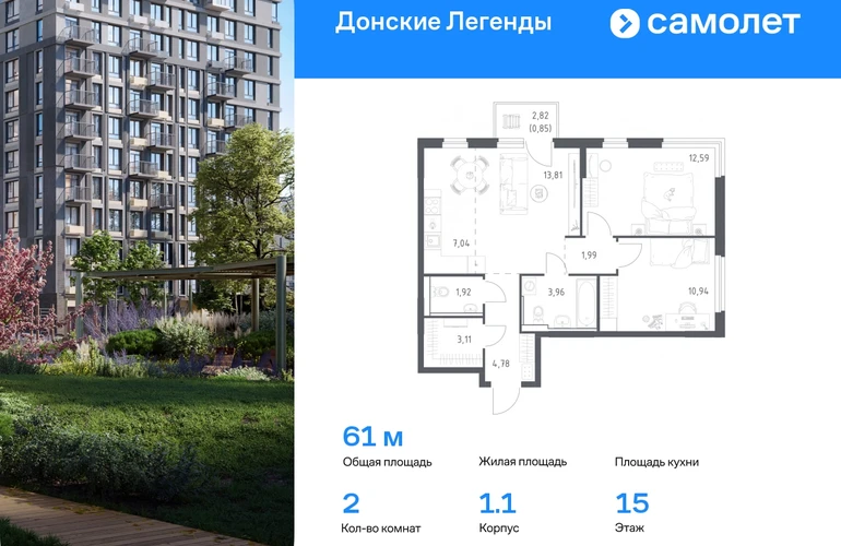 Предлагается 2-комнатная квартира комфорт-класса 60,99 кв.м в корпусе 1.1 на 15 этаже, в ЖК «Донские Легенды» Квартира без отделки. Доступность опции "отделка" и возможность комплектации мебелью и декором уточняйте у застройщика. Приобрести квартиру возможно по специальным акциям от застройщика, с текущими условиями акций можно ознакомиться в блоке “Акций”. Цена динамическая и может отличаться, уточняйте актуальность у застройщика. Чувствовать гордость, когда любимая команда забивает гол, и с удовольствием спешить на тренировку по мини-футболу или теннису — так выглядит атмосфера в «Квартале Чехова» в Ленинском районе. Здесь каждый день станет ценным экспонатом в вашей коллекции впечатлений. Проект расположен рядом с Восточным шоссе и улицей Пойменной, всего в 10 минутах на машине от центра города. За 3 минуты вы доберетесь до Ворошиловского моста, а за 4 — до Темерницкого. Если не хотите ехать на машине, рядом остановки автобусов. Поблизости находится спортивный комплекс «Гребной канал Дон», а стадион «Ростов Арена» ждет любителей футбола. Прогуляться по благоустроенной набережной, повеселиться в аквапарке и подкрепиться мороженым можно в Левобережном парке — до него 5 минут на такси. Утро начнется с прогулки с малышом до одного из 3 детских садов. Рядом есть школа для ребят постарше, детская школа искусств, центр культурного развития и ФОК. В квартале откроются поликлиника со станцией скорой помощи и 2 торговых центра. Архитектура квартала сочетает современность и изящество. Элегантные французские балконы и панорамные окна позволят наслаждаться великолепными пейзажами. Во дворе дети играют на площадках, а взрослые занимаются спортом. У жителей будет собственный ипподром для соревнований по конкуру. А еще подземный и многоуровневые паркинги на 7,5 тысячи машино-мест. Входы в подъезды расположены на уровне земли, что удобно для родителей с колясками и путешественников. Для будущих жителей — квартиры без отделки. Можно реализовать любые дизайнерские идеи в своем новом доме.#yan19-2r1796975#О застройщике