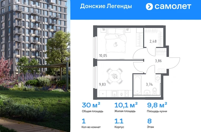 Строим кварталы для жизни с заботой о будущем. Предлагается 1-комнатная квартира комфорт-класса 29,96 кв.м в корпусе 1.1 на 8 этаже, в ЖК «Донские Легенды» Квартира без отделки. Доступность опции «отделка» и возможность комплектации мебелью и декором уточняйте у застройщика. Приобрести квартиру возможно по специальным акциям от застройщика, с текущими условиями акций можно ознакомиться в блоке «Акций». Цена динамическая и может отличаться, уточняйте актуальность у застройщика. Чувствовать гордость, когда любимая команда забивает гол, и с удовольствием спешить на тренировку по мини-футболу или теннису — так выглядит атмосфера в «Квартале Чехова» в Ленинском районе. Здесь каждый день станет ценным экспонатом в вашей коллекции впечатлений. Проект расположен рядом с Восточным шоссе и улицей Пойменной, всего в 10 минутах на машине от центра города. За 3 минуты вы доберетесь до Ворошиловского моста, а за 4 — до Темерницкого. Если не хотите ехать на машине, рядом остановки автобусов. Поблизости находится спортивный комплекс «Гребной канал Дон», а стадион «Ростов Арена» ждет любителей футбола. Прогуляться по благоустроенной набережной, повеселиться в аквапарке и подкрепиться мороженым можно в Левобережном парке — до него 5 минут на такси. Утро начнется с прогулки с малышом до одного из 3 детских садов. Рядом есть школа для ребят постарше, детская школа искусств, центр культурного развития и ФОК. В квартале откроются поликлиника со станцией скорой помощи и 2 торговых центра. Архитектура квартала сочетает современность и изящество. Элегантные французские балконы и панорамные окна позволят наслаждаться великолепными пейзажами. Во дворе дети играют на площадках, а взрослые занимаются спортом. У жителей будет собственный ипподром для соревнований по конкуру. А еще подземный и многоуровневые паркинги на 7,5 тысячи машино-мест. Входы в подъезды расположены на уровне земли, что удобно для родителей с колясками и путешественников. Для будущих жителей — квартиры без отделки. Можно реализовать любые дизайнерские идеи в своем новом доме.#yan19-2r1803111#О застройщике