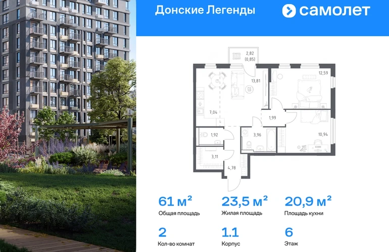 Строим кварталы для жизни с заботой о будущем. Предлагается 2-комнатная квартира комфорт-класса 60,99 кв.м в корпусе 1.1 на 6 этаже, в ЖК «Донские Легенды» Квартира с предчистовой отделкой. Доступность дополнительных опций уточняйте у застройщика. Приобрести квартиру возможно по специальным акциям от застройщика, с текущими условиями акций можно ознакомиться в блоке «Акций». Цена динамическая и может отличаться, уточняйте актуальность у застройщика. Чувствовать гордость, когда любимая команда забивает гол, и с удовольствием спешить на тренировку по мини-футболу или теннису — так выглядит атмосфера в «Квартале Чехова» в Ленинском районе. Здесь каждый день станет ценным экспонатом в вашей коллекции впечатлений. Проект расположен рядом с Восточным шоссе и улицей Пойменной, всего в 10 минутах на машине от центра города. За 3 минуты вы доберетесь до Ворошиловского моста, а за 4 — до Темерницкого. Если не хотите ехать на машине, рядом остановки автобусов. Поблизости находится спортивный комплекс «Гребной канал Дон», а стадион «Ростов Арена» ждет любителей футбола. Прогуляться по благоустроенной набережной, повеселиться в аквапарке и подкрепиться мороженым можно в Левобережном парке — до него 5 минут на такси. Утро начнется с прогулки с малышом до одного из 3 детских садов. Рядом есть школа для ребят постарше, детская школа искусств, центр культурного развития и ФОК. В квартале откроются поликлиника со станцией скорой помощи и 2 торговых центра. Архитектура квартала сочетает современность и изящество. Элегантные французские балконы и панорамные окна позволят наслаждаться великолепными пейзажами. Во дворе дети играют на площадках, а взрослые занимаются спортом. У жителей будет собственный ипподром для соревнований по конкуру. А еще подземный и многоуровневые паркинги на 7,5 тысячи машино-мест. Входы в подъезды расположены на уровне земли, что удобно для родителей с колясками и путешественников. Для будущих жителей — квартиры без отделки. Можно реализовать любые дизайнерские идеи в своем новом доме.#yan19-2r1807982#О застройщике