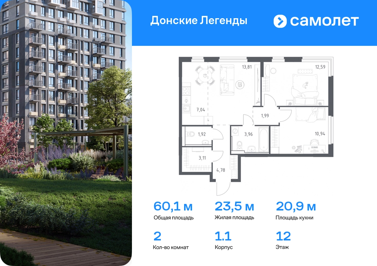 Строим кварталы для жизни с заботой о будущем. Предлагается 2-комнатная квартира комфорт-класса 60,14 кв.м в корпусе 1.1 на 12 этаже, в ЖК «Донские Легенды» Квартира с предчистовой отделкой. Доступность дополнительных опций уточняйте у застройщика. Приобрести квартиру возможно по специальным акциям от застройщика, с текущими условиями акций можно ознакомиться в блоке «Акций». Цена динамическая и может отличаться, уточняйте актуальность у застройщика. Чувствовать гордость, когда любимая команда забивает гол, и с удовольствием спешить на тренировку по мини-футболу или теннису — так выглядит атмосфера в «Квартале Чехова» в Ленинском районе. Здесь каждый день станет ценным экспонатом в вашей коллекции впечатлений. Проект расположен рядом с Восточным шоссе и улицей Пойменной, всего в 10 минутах на машине от центра города. За 3 минуты вы доберетесь до Ворошиловского моста, а за 4 — до Темерницкого. Если не хотите ехать на машине, рядом остановки автобусов. Поблизости находится спортивный комплекс «Гребной канал Дон», а стадион «Ростов Арена» ждет любителей футбола. Прогуляться по благоустроенной набережной, повеселиться в аквапарке и подкрепиться мороженым можно в Левобережном парке — до него 5 минут на такси. Утро начнется с прогулки с малышом до одного из 3 детских садов. Рядом есть школа для ребят постарше, детская школа искусств, центр культурного развития и ФОК. В квартале откроются поликлиника со станцией скорой помощи и 2 торговых центра. Архитектура квартала сочетает современность и изящество. Элегантные французские балконы и панорамные окна позволят наслаждаться великолепными пейзажами. Во дворе дети играют на площадках, а взрослые занимаются спортом. У жителей будет собственный ипподром для соревнований по конкуру. А еще подземный и многоуровневые паркинги на 7,5 тысячи машино-мест. Входы в подъезды расположены на уровне земли, что удобно для родителей с колясками и путешественников. Для будущих жителей — квартиры без отделки. Можно реализовать любые дизайнерские идеи в своем новом доме.#yan19-2r1809679#О застройщике
