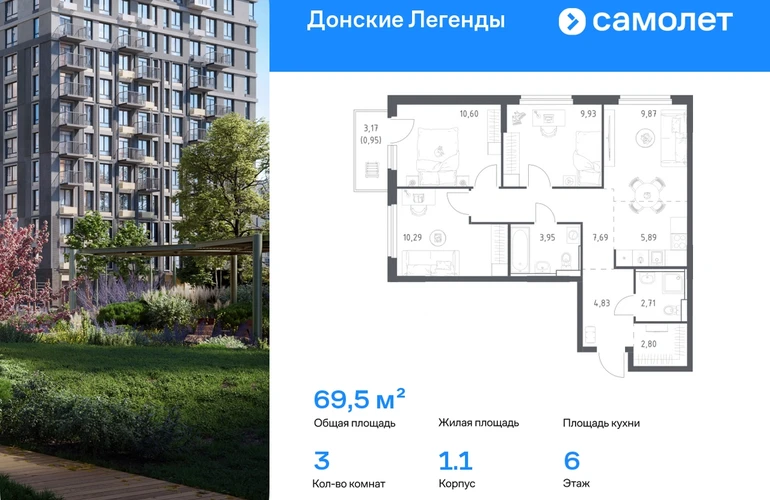 Строим кварталы для жизни с заботой о будущем. Предлагается 3-комнатная квартира комфорт-класса 69,51 кв.м в корпусе 1.1 на 6 этаже, в ЖК «Донские Легенды» Квартира с предчистовой отделкой. Доступность дополнительных опций уточняйте у застройщика. Приобрести квартиру возможно по специальным акциям от застройщика, с текущими условиями акций можно ознакомиться в блоке «Акций». Цена динамическая и может отличаться, уточняйте актуальность у застройщика. Чувствовать гордость, когда любимая команда забивает гол, и с удовольствием спешить на тренировку по мини-футболу или теннису — так выглядит атмосфера в «Квартале Чехова» в Ленинском районе. Здесь каждый день станет ценным экспонатом в вашей коллекции впечатлений. Проект расположен рядом с Восточным шоссе и улицей Пойменной, всего в 10 минутах на машине от центра города. За 3 минуты вы доберетесь до Ворошиловского моста, а за 4 — до Темерницкого. Если не хотите ехать на машине, рядом остановки автобусов. Поблизости находится спортивный комплекс «Гребной канал Дон», а стадион «Ростов Арена» ждет любителей футбола. Прогуляться по благоустроенной набережной, повеселиться в аквапарке и подкрепиться мороженым можно в Левобережном парке — до него 5 минут на такси. Утро начнется с прогулки с малышом до одного из 3 детских садов. Рядом есть школа для ребят постарше, детская школа искусств, центр культурного развития и ФОК. В квартале откроются поликлиника со станцией скорой помощи и 2 торговых центра. Архитектура квартала сочетает современность и изящество. Элегантные французские балконы и панорамные окна позволят наслаждаться великолепными пейзажами. Во дворе дети играют на площадках, а взрослые занимаются спортом. У жителей будет собственный ипподром для соревнований по конкуру. А еще подземный и многоуровневые паркинги на 7,5 тысячи машино-мест. Входы в подъезды расположены на уровне земли, что удобно для родителей с колясками и путешественников. Для будущих жителей — квартиры без отделки. Можно реализовать любые дизайнерские идеи в своем новом доме.#yan19-2r1819631#О застройщике