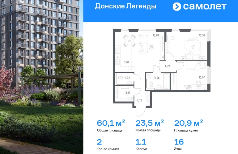 Строим кварталы для жизни с заботой о будущем. Предлагается 2-комнатная квартира комфорт-класса 60,14 кв.м в корпусе 1.1 на 16 этаже, в ЖК «Донские Легенды» Квартира с предчистовой отделкой. Доступность дополнительных опций уточняйте у застройщика. Приобрести квартиру возможно по специальным акциям от застройщика, с текущими условиями акций можно ознакомиться в блоке «Акций». Цена динамическая и может отличаться, уточняйте актуальность у застройщика. Чувствовать гордость, когда любимая команда забивает гол, и с удовольствием спешить на тренировку по мини-футболу или теннису — так выглядит атмосфера в «Квартале Чехова» в Ленинском районе. Здесь каждый день станет ценным экспонатом в вашей коллекции впечатлений. Проект расположен рядом с Восточным шоссе и улицей Пойменной, всего в 10 минутах на машине от центра города. За 3 минуты вы доберетесь до Ворошиловского моста, а за 4 — до Темерницкого. Если не хотите ехать на машине, рядом остановки автобусов. Поблизости находится спортивный комплекс «Гребной канал Дон», а стадион «Ростов Арена» ждет любителей футбола. Прогуляться по благоустроенной набережной, повеселиться в аквапарке и подкрепиться мороженым можно в Левобережном парке — до него 5 минут на такси. Утро начнется с прогулки с малышом до одного из 3 детских садов. Рядом есть школа для ребят постарше, детская школа искусств, центр культурного развития и ФОК. В квартале откроются поликлиника со станцией скорой помощи и 2 торговых центра. Архитектура квартала сочетает современность и изящество. Элегантные французские балконы и панорамные окна позволят наслаждаться великолепными пейзажами. Во дворе дети играют на площадках, а взрослые занимаются спортом. У жителей будет собственный ипподром для соревнований по конкуру. А еще подземный и многоуровневые паркинги на 7,5 тысячи машино-мест. Входы в подъезды расположены на уровне земли, что удобно для родителей с колясками и путешественников. Для будущих жителей — квартиры без отделки. Можно реализовать любые дизайнерские идеи в своем новом доме.#yan19-2r1822440#О застройщике